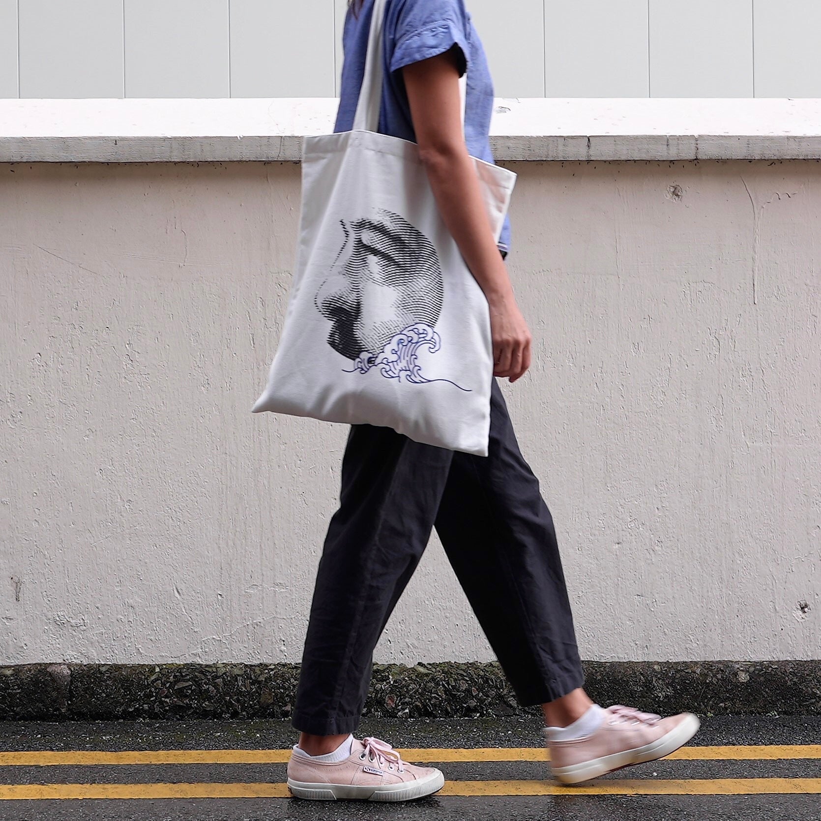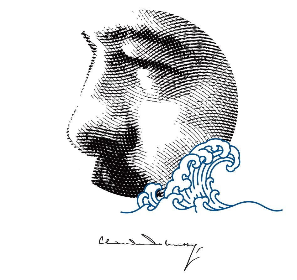 Tote bag with stylised illustration of popular French composer Claude Debussy and autograph. The waves are a reference to the famous Great Wave off Kanagawa by Hokusai, an artwork which Debussy greatly admired, which also inspired his well-known tone poem of the sea, La Mer.